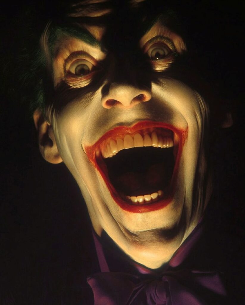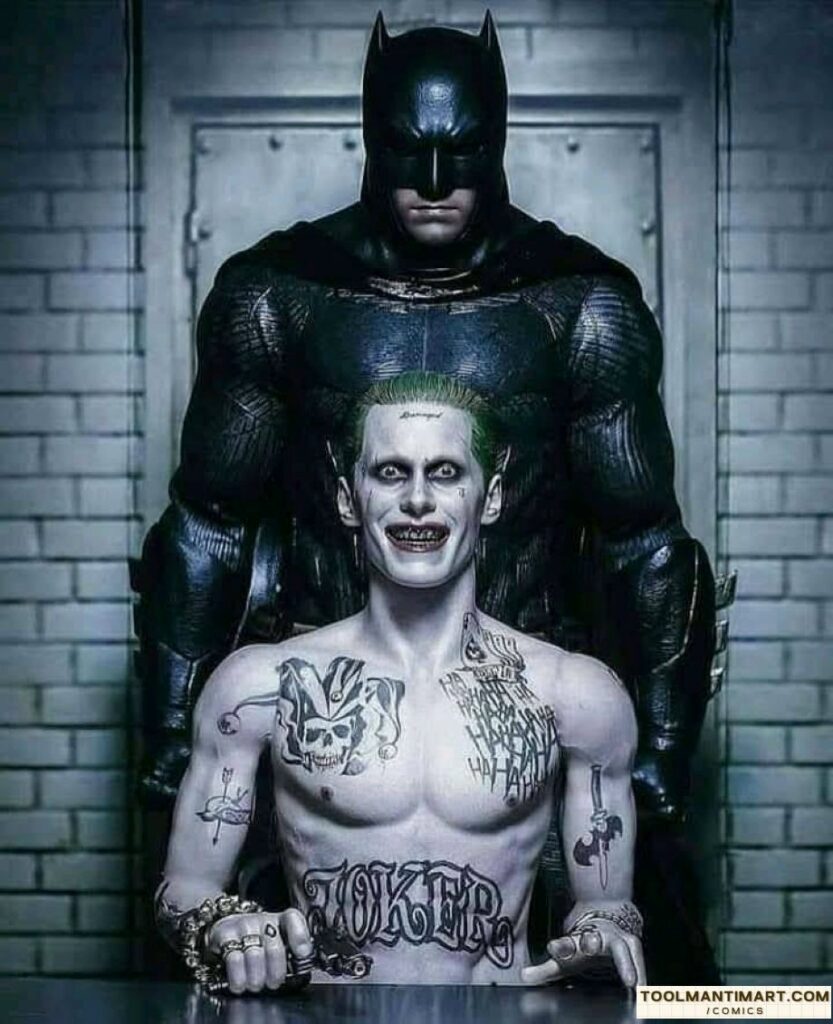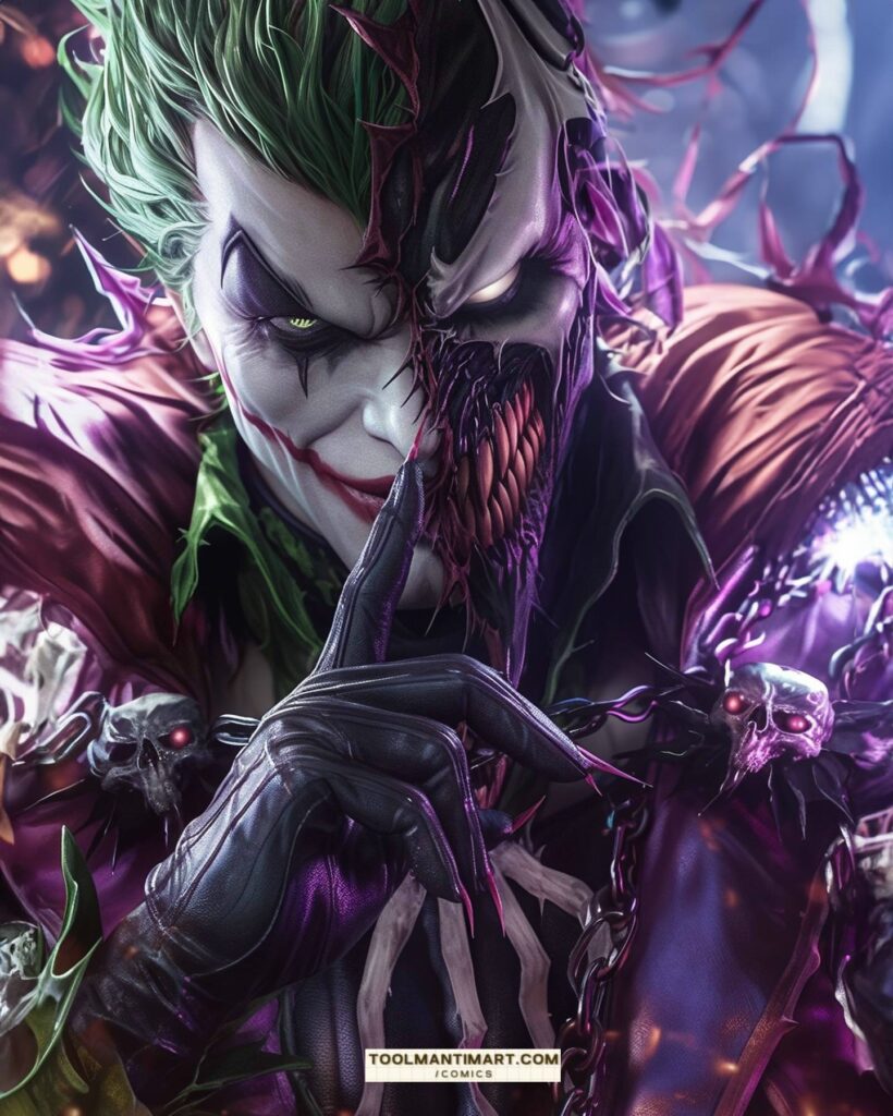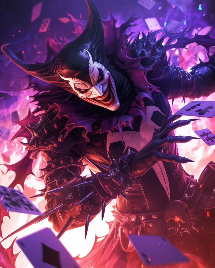 The Joker possesses no superhuman abilities, instead using his expertise in chemical engineering to develop poisonous or lethal concoctions and thematic weaponry, including razor-tipped playing cards, deadly joy buzzers, and acid-spraying lapel flowers. The Joker sometimes works with other Gotham City supervillains, such as the Penguin and Two-Face, and groups like the Injustice Gang and Injustice League, but these relationships often collapse due to the Joker’s desire for unbridled chaos. A romantic interest for the Joker, his former psychiatrist and sidekick Harley Quinn, was introduced in the 1990s. Although his primary obsession is Batman, the Joker has also fought other heroes, including Superman and Wonder Woman.