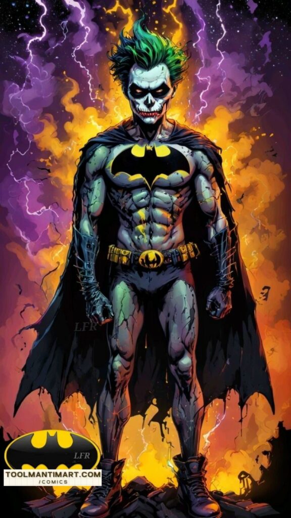 In the DC Universe, the Joker is portrayed as a criminal mastermind and the antithesis of Batman in personality and appearance. He was introduced as a psychopath with a warped, sadistic sense of humor but became a comical prankster in the late 1950s in response to regulation by the Comics Code Authority, before returning to his darker roots during the early 1970s. The Joker has been part of defining Batman stories, including the murder of Jason Toddโthe second Robin and Batman’s wardโin “A Death in the Family” (1988) and the paralysis of Barbara Gordonโthe first Batgirlโin The Killing Joke (1988). Unlike many supervillains, the Joker does not have a definitive origin story, but various possible ones have been developed. The most common story involves him falling into a tank of chemical waste that bleaches his skin chalk-white, turns his hair and eyes cobalt-green and lips ruby-red, and spasms his face that left him with a rictus and unidentifiable by any means; the resulting disfigurement drives him insane.